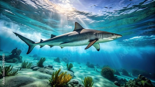 Fototapeta premium Shark's sleek, triangular dorsal fin slices through turquoise ocean water,...