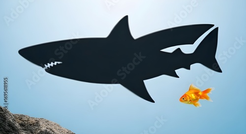 Obraz premium Shark silhouette chasing goldfish in the sea