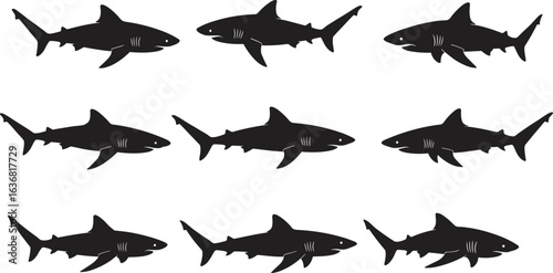 © Zahid Creatives, Fototapeta premium Shark silhouette pattern, repeated marine predator vector illustration, black sea animal design for decoration, seamless ocean wildlife artwork