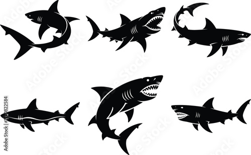 © Silhouetteart, Fototapeta premium Shark Silhouette Vector Illustration - Marine Animal Underwater Art. Ocean Predator Sea Life, Great White Shark, Shark Fin, Swimming Shark, Dangerous Shark Design. Sea Creature and Marine Life Clipart