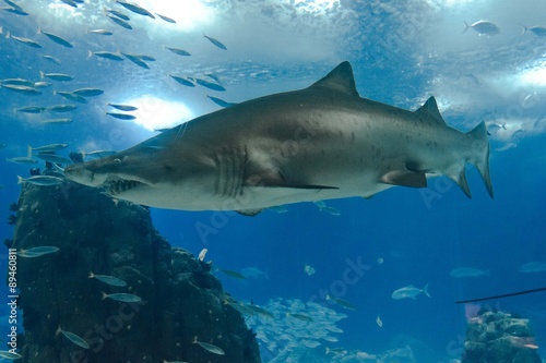© greta gabaglio, Fototapeta premium Shark swimming in Lisbon Aquarium, surrounded by other little fish