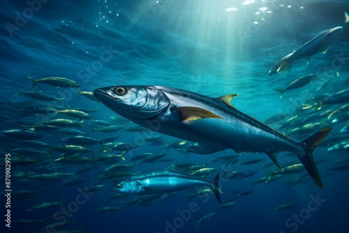 © enter, Fototapeta premium Shark swimming in ocean and aquarium environment with various underwater fish and marine life