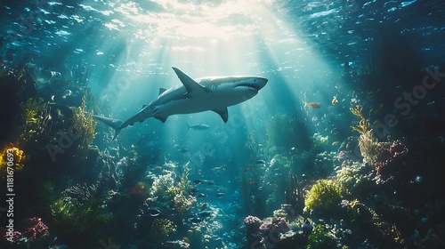 Naklejka premium Shark swimming in vibrant underwater ecosystem.