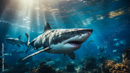 Fototapeta premium Shark swimming on deep ocean. Wildlife concept.