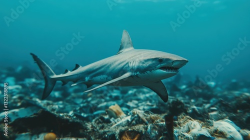 Obraz premium Shark swimming over polluted ocean floor covered in debris