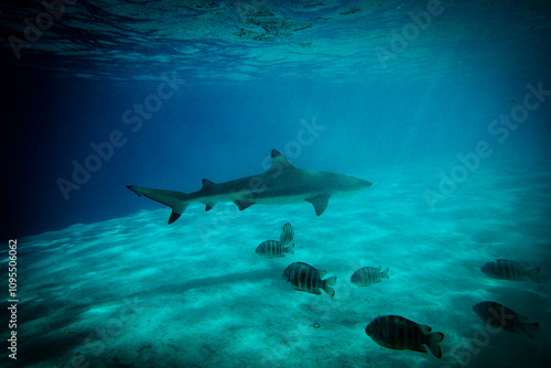 © DevinSuperTramp, Fototapeta premium Shark swimming past fish - beautiful underwater shot