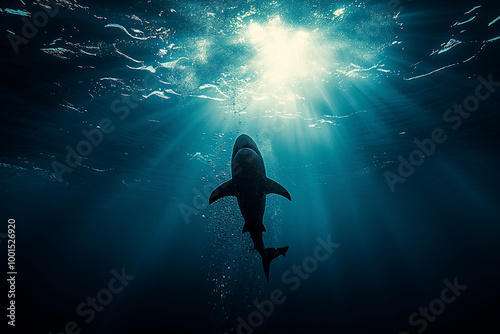 Obraz premium Shark swimming underwater in the ocean with sunlight filtering through the blue sea in a serene marine habitat
