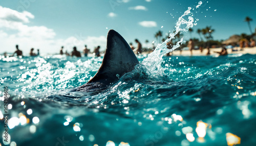 © abu, Fototapeta premium Shark tail fin breaks ocean surface near shore, creating tension and contrast.