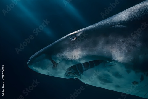 © Md, Naklejka premium Shark underwater in deep dark ocean with sun rays