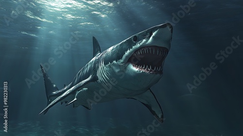 © simba kim, Fototapeta premium Shark with open mouth and dark sea, Generative AI