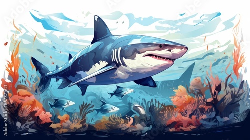 © NeeArtwork, Fototapeta premium sharks gliding through water aquarium background flat design side view ocean exploration theme water color Triadic Color Scheme