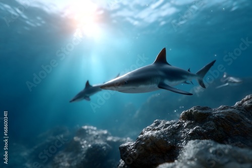 Fototapeta premium Sharks swimming through sunlit ocean depths