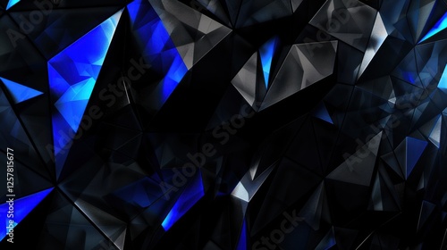 © Allie, Obraz premium Sharp Blue triangles and polygons on a dark background. Geometric pattern for banner template with white space in the center for text. Minimalist wallpaper with copy space.