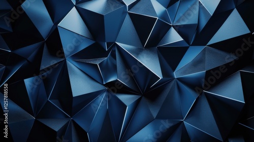 © Allie, Obraz premium Sharp Blue triangles and polygons on a dark background. Geometric pattern for banner template with white space in the center for text. Minimalist wallpaper with copy space.