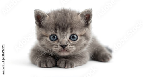 Obraz premium Sharp close up of an adorable little gray kitten posed on a bright white...