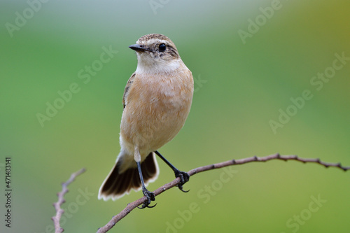 © prin79, Naklejka premium sharp eyes and clear feathers of brown bird perching on thin branch over green background, female siberian stonechat