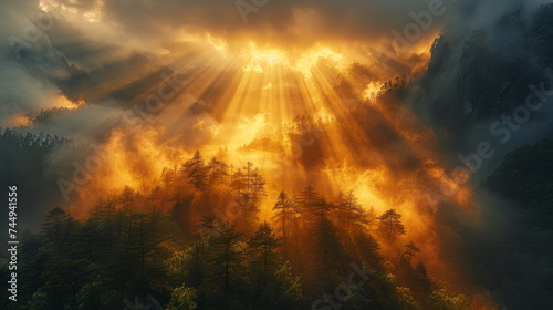 © JKLoma, Obraz premium sharp jagged yellow mountains of Huangshan China covered in fog and clouds,generative ai