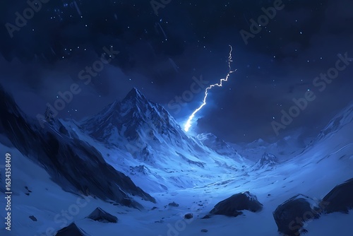 © tayyaba, Fototapeta premium Sharp lightning strike in the middle of a stormy night above snow-covered mountains