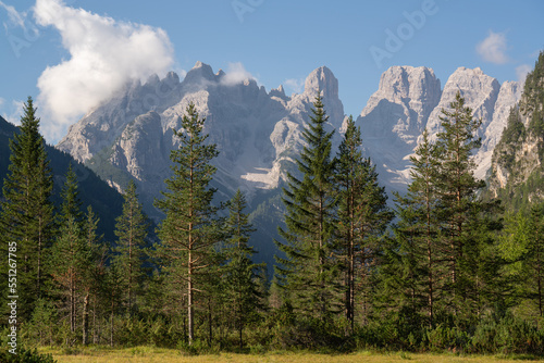 © Alexander, Fototapeta premium Sharp mountain peaks against the blue morning sky. Green firs in the foreground. Walking in the fresh air brings joy. The greatness of nature. Tourist routes