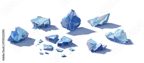 Naklejka premium Shattered ice crystals, various fragments of a broken substance, light blue, iridescent hues, with clear shadows