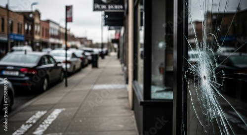 Obraz premium Shattered Storefront Window with Bullet Hole on Urban Street.