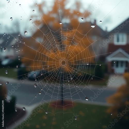 Naklejka premium Shattered Window with Water Droplets & Autumn Bokeh | Serene, Melancholic Suburban Scene in Warm Tones