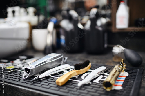 Fototapeta premium Shaving accessories and tools in barber shop.