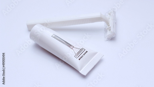 © Birch Photography, Naklejka premium shaving cream and razor on white background.