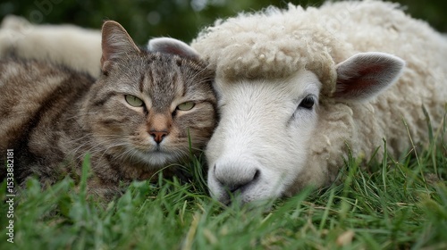 © Fandi Comp, Obraz premium Sheep and cat resting together