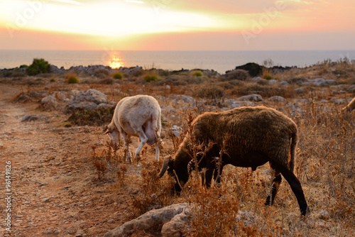 © Khorzhevska, Fototapeta premium sheep and goat pasture over sunset