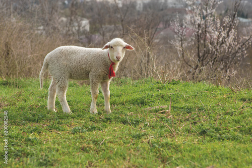 Naklejka premium Sheep and goats graze on green grass in spring