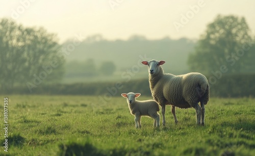 © El Media, Obraz premium Sheep and Lamb Standing in a Field on a Misty Morning