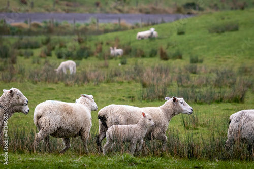 © fotoliasc2014, Obraz premium Sheep and lambs, in a paddock, Pouawa, near Gisborne, New Zealand