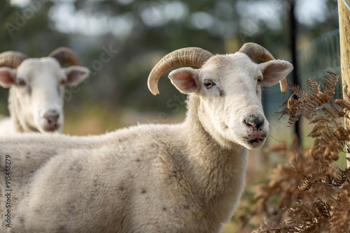 © Phoebe, Naklejka premium Sheep and Lambs in Australian Fields drinking milk and eating grass