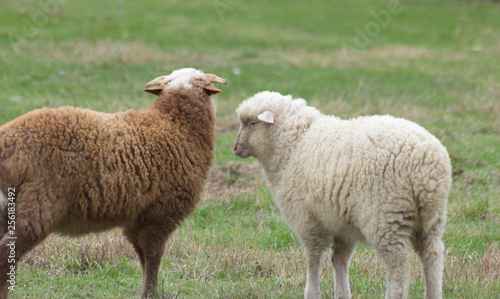 © Shuano, Fototapeta premium Sheep and lambs on pasture graze.