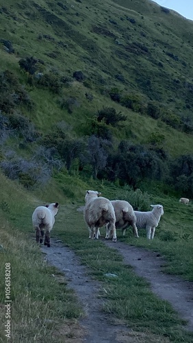 © Heavenlyflower, Obraz premium Sheep and lambs walking on the mountain. Sheep on the hill
