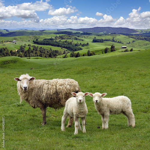 © NMint, Fototapeta premium Sheep and wo lambs grazing on the picturesque landscape backgrou
