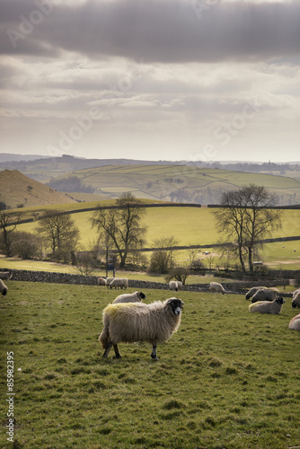 © veneratio, Fototapeta premium Sheep animals in farm landscape on sunny day in Peak District UK