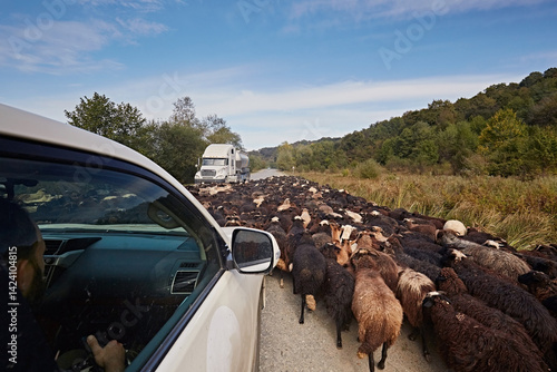 © ILIA, Fototapeta premium Sheep are walking along the road, blocking the passage of cars