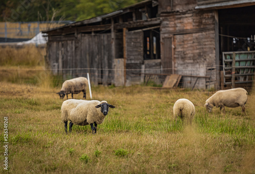 © Elena_Alex, Fototapeta premium Sheep at the local farm. A group of sheep on a pasture. A small herd of Suffolk sheep with black face and legs