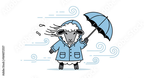 © Siti, Naklejka premium Sheep battling the wind and rain with an umbrella in a charming illustration