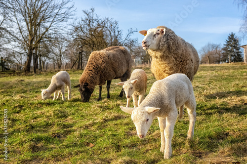 © Ingo Bartussek, Fototapeta premium Sheep, Ewes with Lambs on the Pasture