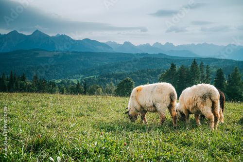 © kovop58, Fototapeta premium Sheep Flourishing on Fertile Pastures with the Spectacular High Tatras Towering Behind: An Insight into the Dairy Farming Life in Slovakia and Poland