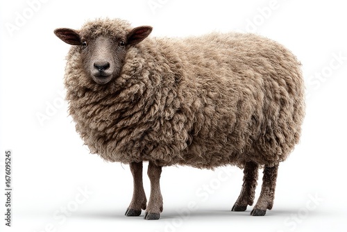 Fototapeta premium Sheep, full shot, facing forward, against white background. Fluffy, light brown/gray coat. Solid, alert gaze