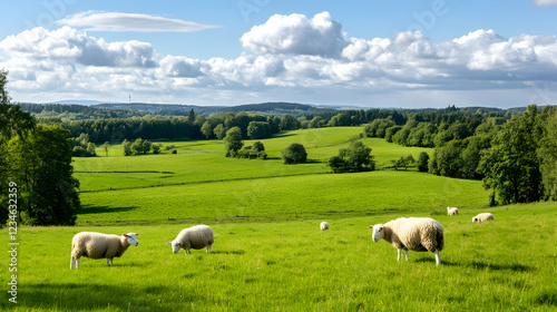 Fototapeta premium Sheep graze idyllic green pasture, rolling hills background; perfect for travel brochures