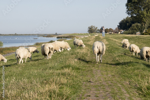 © Joop Hoek, Fototapeta premium Sheep graze on a dutch dike