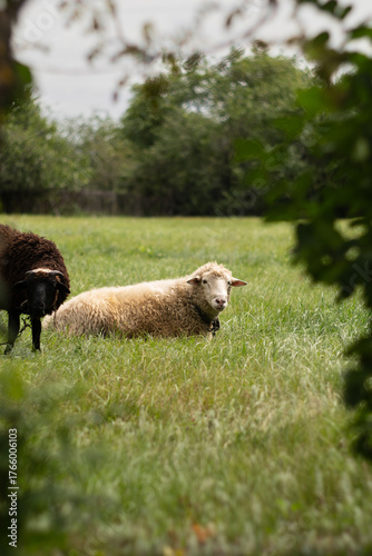 © RazinStock, Fototapeta premium Sheep graze on the lawn. A flock of sheep on the lawn