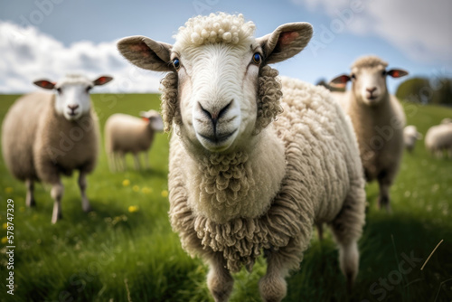 Fototapeta premium Sheep graze the pastures in mountain. Herd of sheep and lambs grazing grass on cloudy day. AI Generation