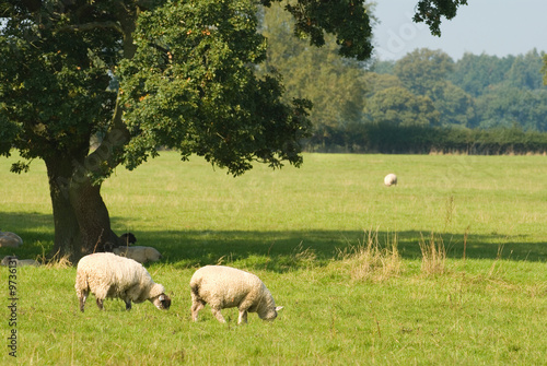 © Springfield Gallery, Fototapeta premium Sheep grazing and resting under the shade of a tree