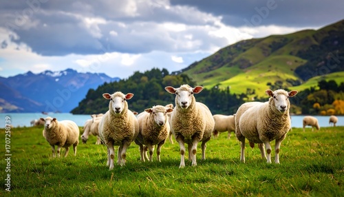 © Berkah, Fototapeta premium Sheep grazing by a lake